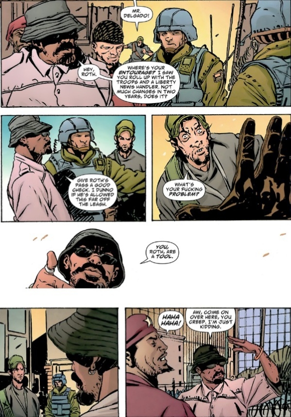 Yet another ceasefire is in place in the DMZ, this one negotiated so that the city can elect a governor. Both the Free States and the United States put forth candidates that DMZ residents have never heard of. Matty, having once again renewed his association with Liberty News, is covering their joint press conference (this kind of joint appearance and negotiation is noteworthy in a historical context because in the Civil War the Union steadfastly refused to recognize the Confederacy or negotiate with them on equal terms). It's interrupted by a DMZ resident named Parco Delgado, his look and the look of his bodyguards reminiscent of Che Guevara, who denounces the election as illegitimate because the two sides haven't allowed anyone from the DMZ on the ballot.
